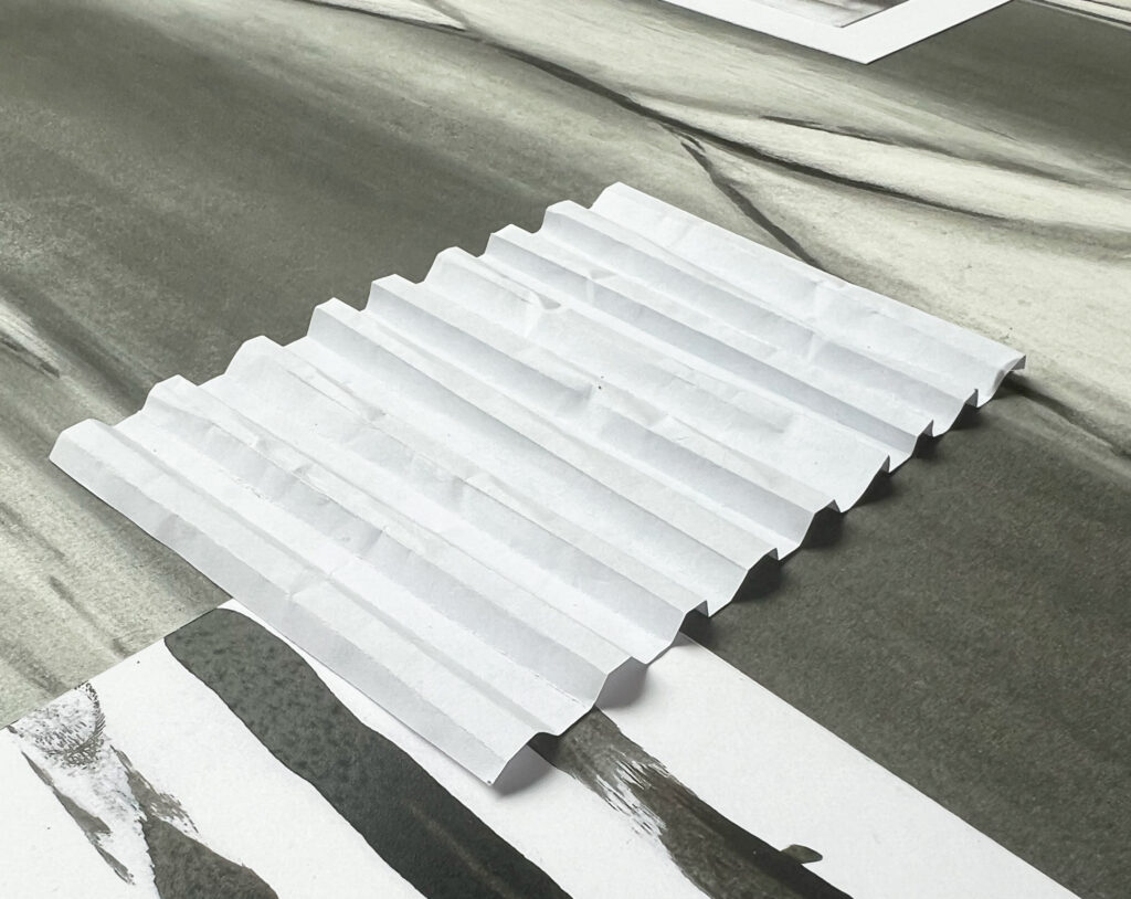 Ensuite, j’ai exploré le passage du tracé au volume en réalisant une maquette ajourée et ouverte, qui traduit librement les tensions et les équilibres présents dans mes dessins.
